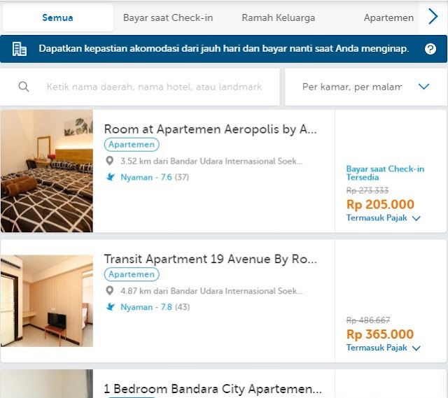 Maka jadilah aku menelusuri traveloka untuk mencari apartement yang dekat bandara Cengkareng. Dan ternyata hei lihat ada yang murah juga rupanya