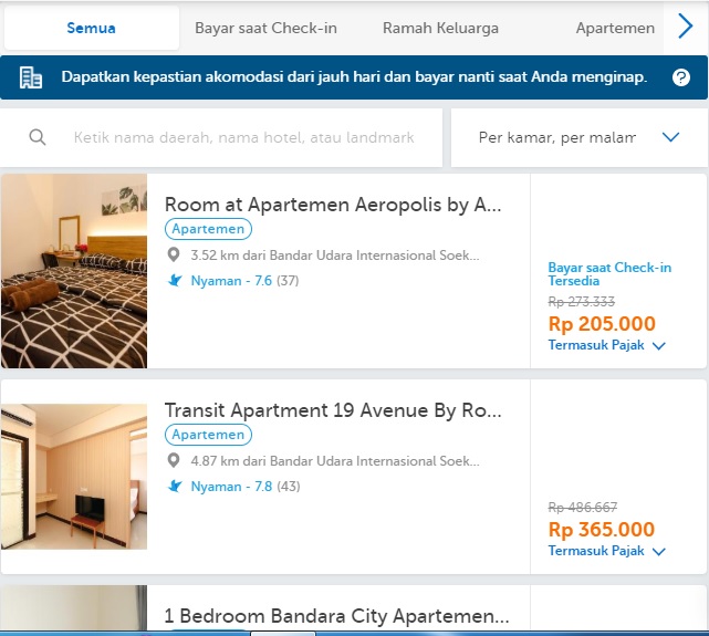 Maka jadilah aku menelusuri traveloka untuk mencari apartement yang dekat bandara Cengkareng. Dan ternyata hei lihat ada yang murah juga rupanya