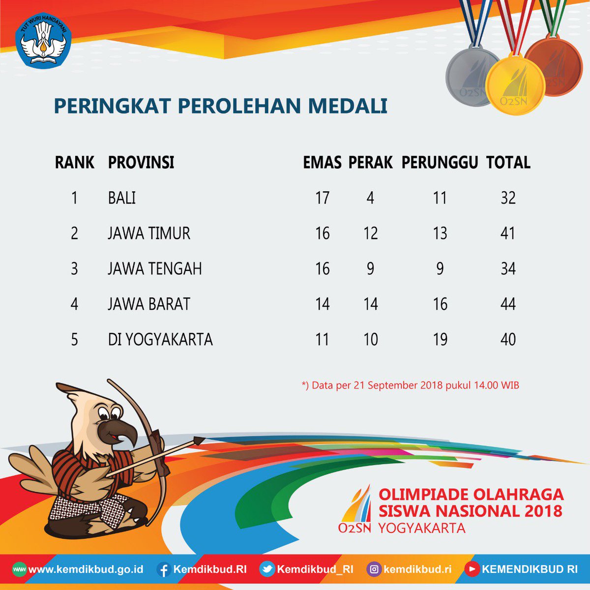 Provinsi Bali mencatatkan diri sebagai juara umum pada Olimpiade Olahraga Siswa Nasional 2018 dengan raihan 17 emas 4 perak dan 11 perunggu. Disusul oleh Juara Umum O2SN 2017, Jawa Timur dengan perolehan 16 emas 11 perak dan 13 perunggu. Sementara Provinsi Jawa Tengah meraih posisi ketiga dengan raihan 16 emas 7 perak dan 9 perunggu